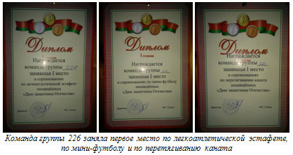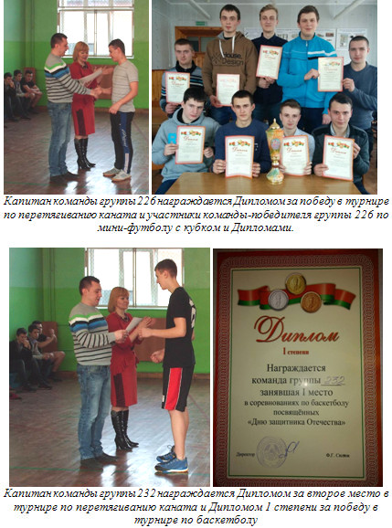 Кроме этого в лицее 23 февраля завершились внутрилицейские турниры, посвященные Дню защитников Отечества и Вооруженных сил Республики Беларусь по перетягиванию каната, по легкоатлетической эстафете, по мини-футболу, по баскетболу. В трех финалах стали лучшими команда 3 курса группы 226 «Электомеханик по лифтам» по перетягиванию каната, по легкоатлетической эстафете и по мини-футболу.
