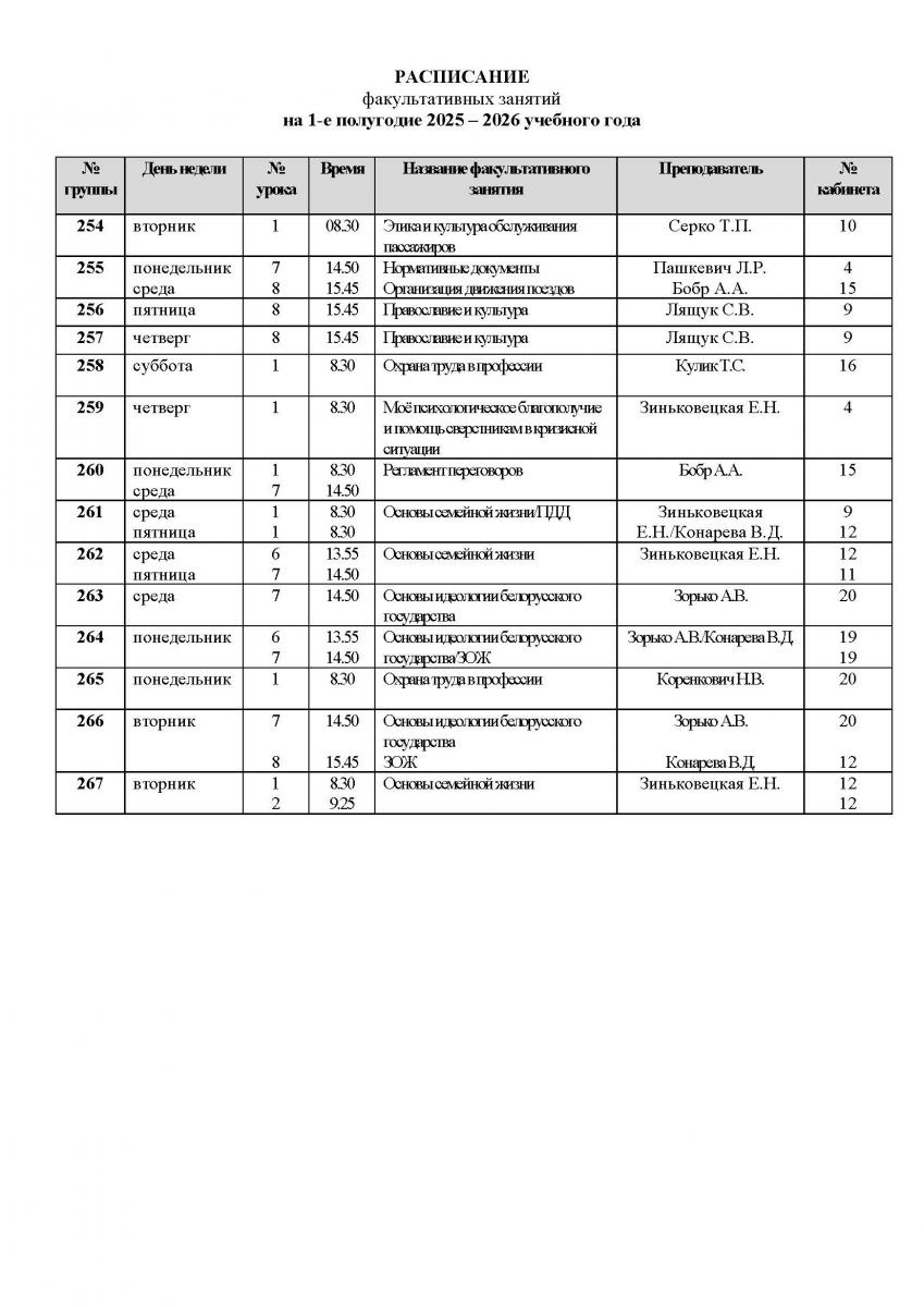 Расписание факультативных занятий